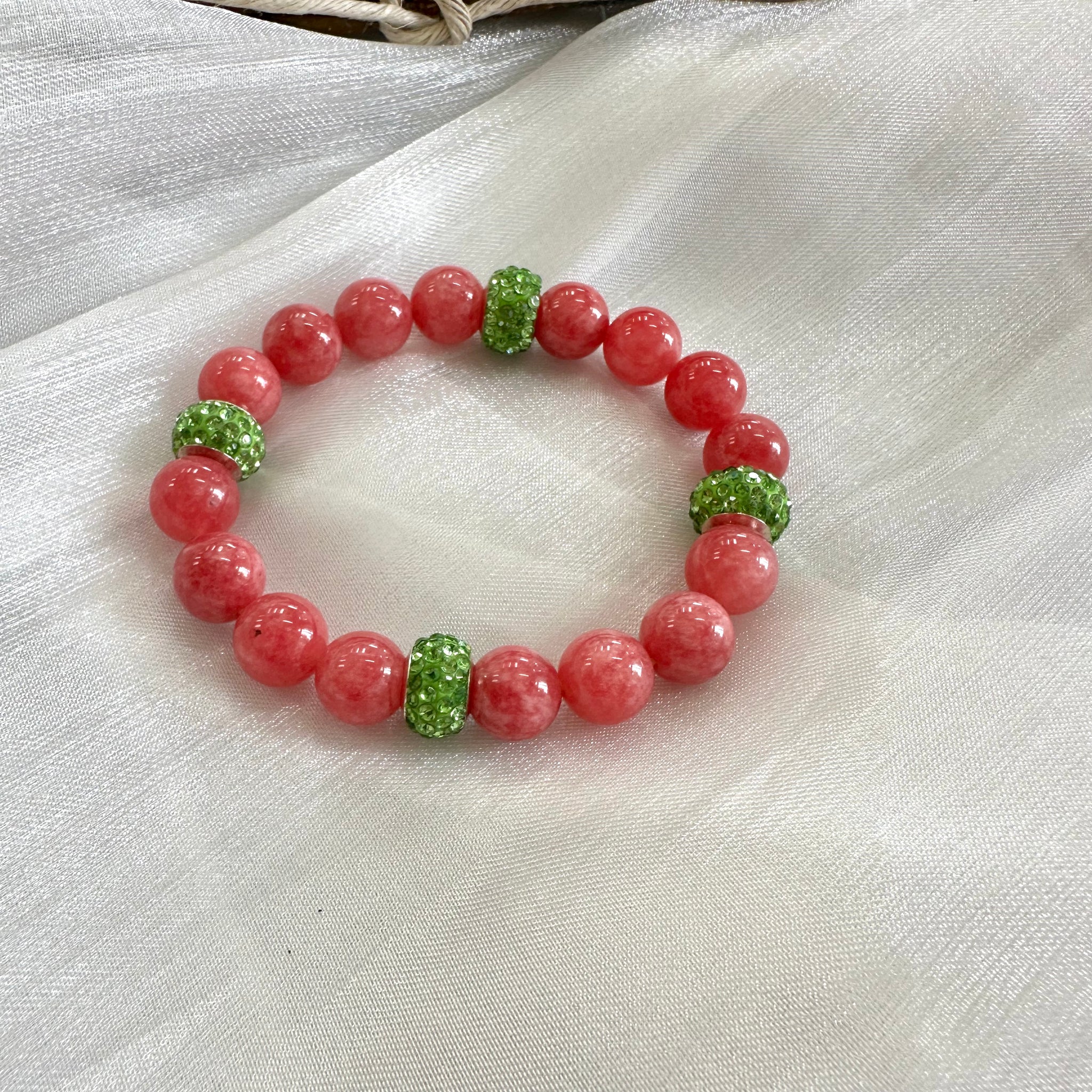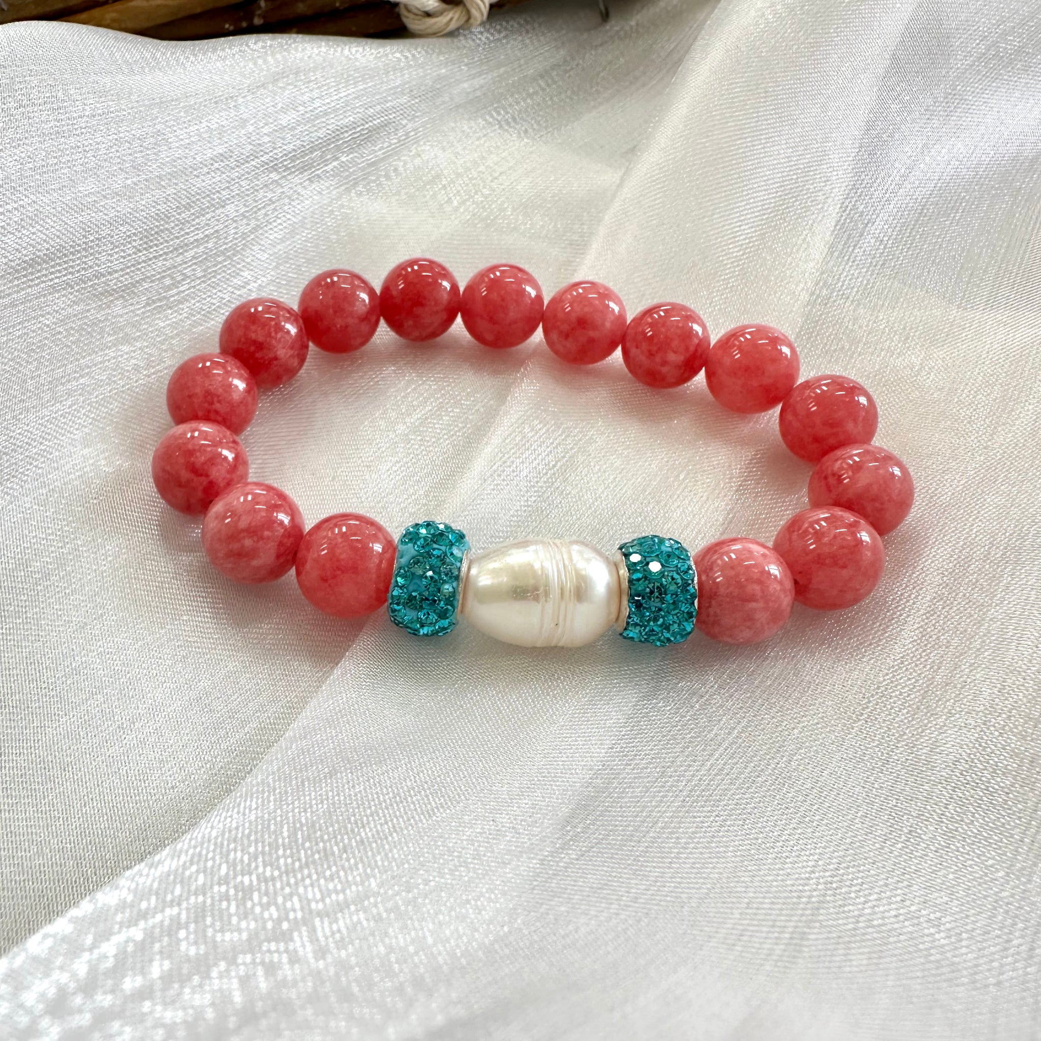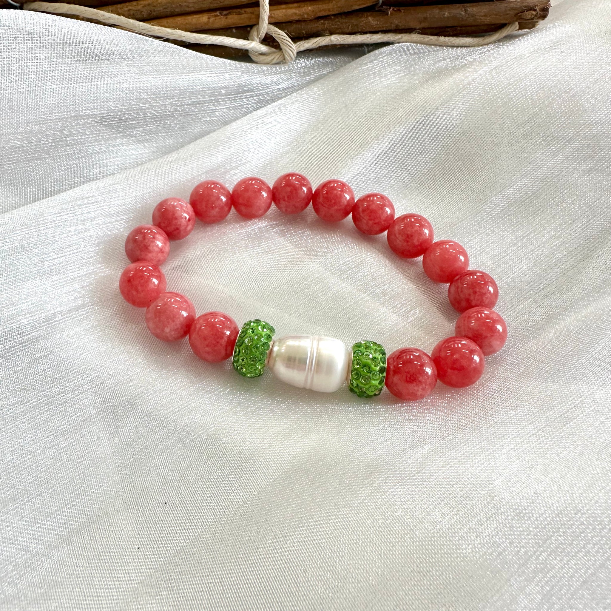 Add bold colour and vibrant energy to your jewelry collection with this handcrafted red jade bracelet, designed with natural 10mm red jade beads, a luminous freshwater pearl, and sparkling rhinestone accents in blue or green tones. The rich red hue makes this piece eye-catching yet refined, adding warmth and sophistication to any outfit.