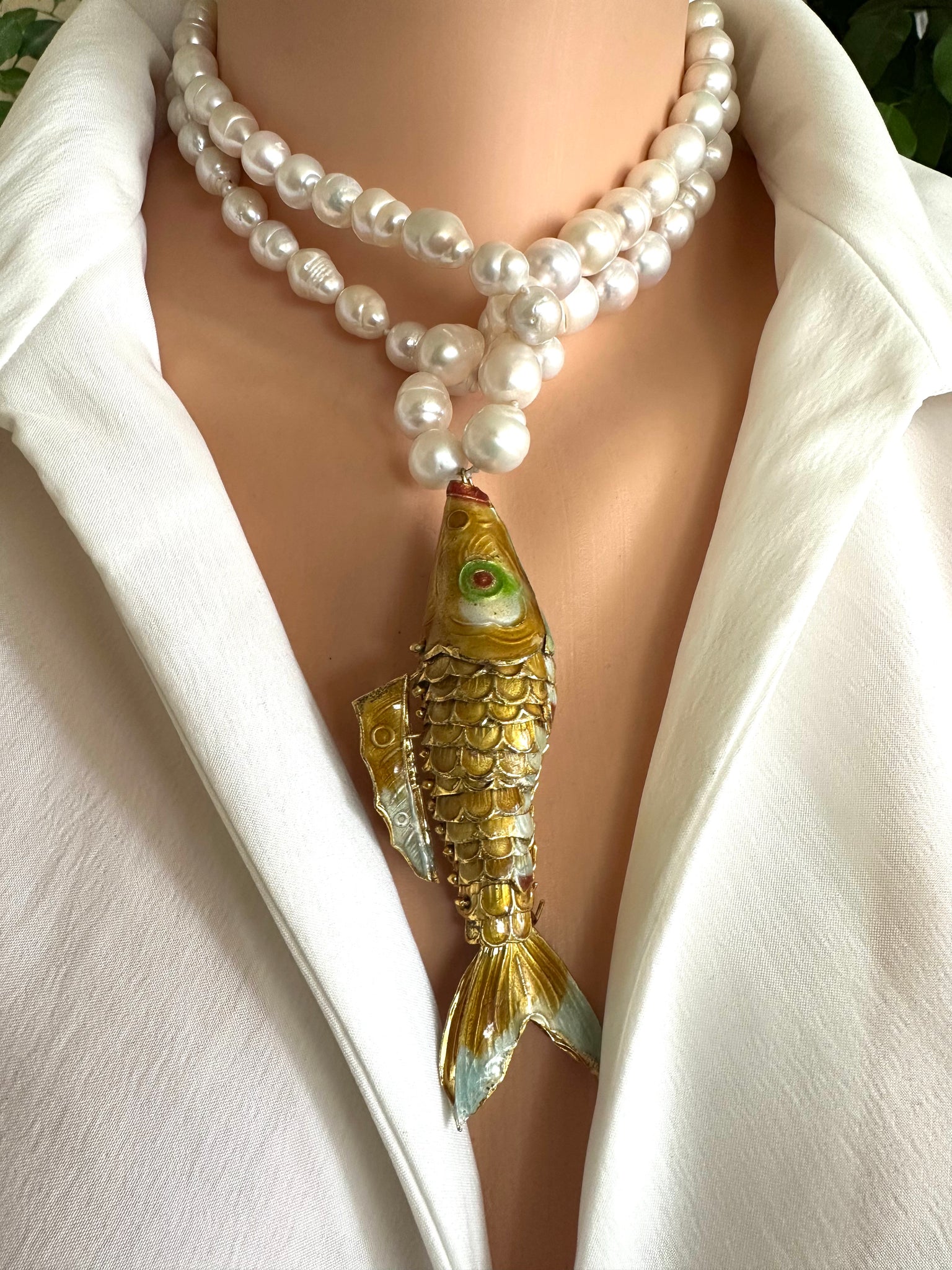 A statement long pearl necklace crafted with hand knotted 9–11mm white baroque pearls and finished with a large gold-tone cloisonné fish pendant, designed to be worn long or doubled for versatile styling.