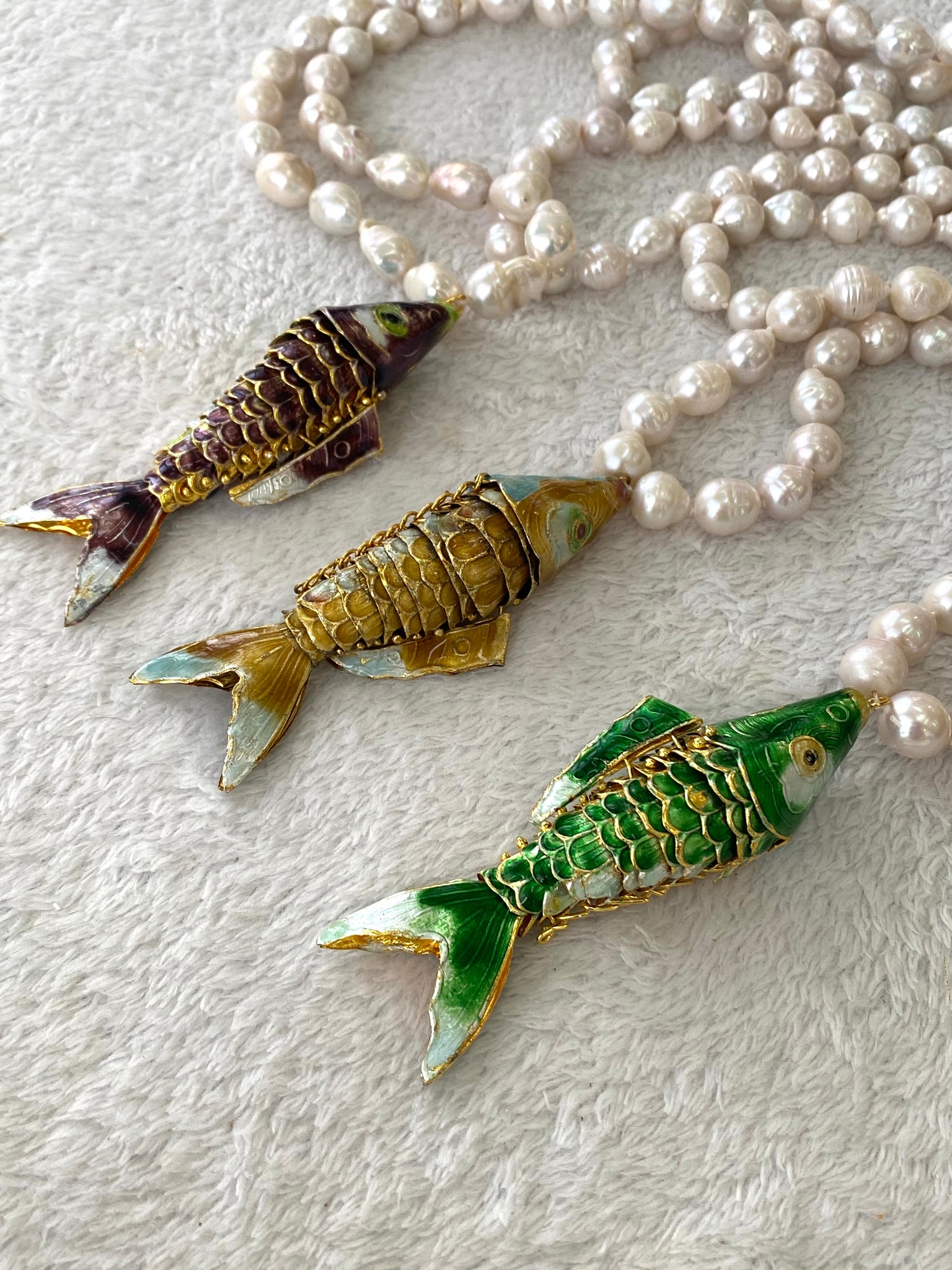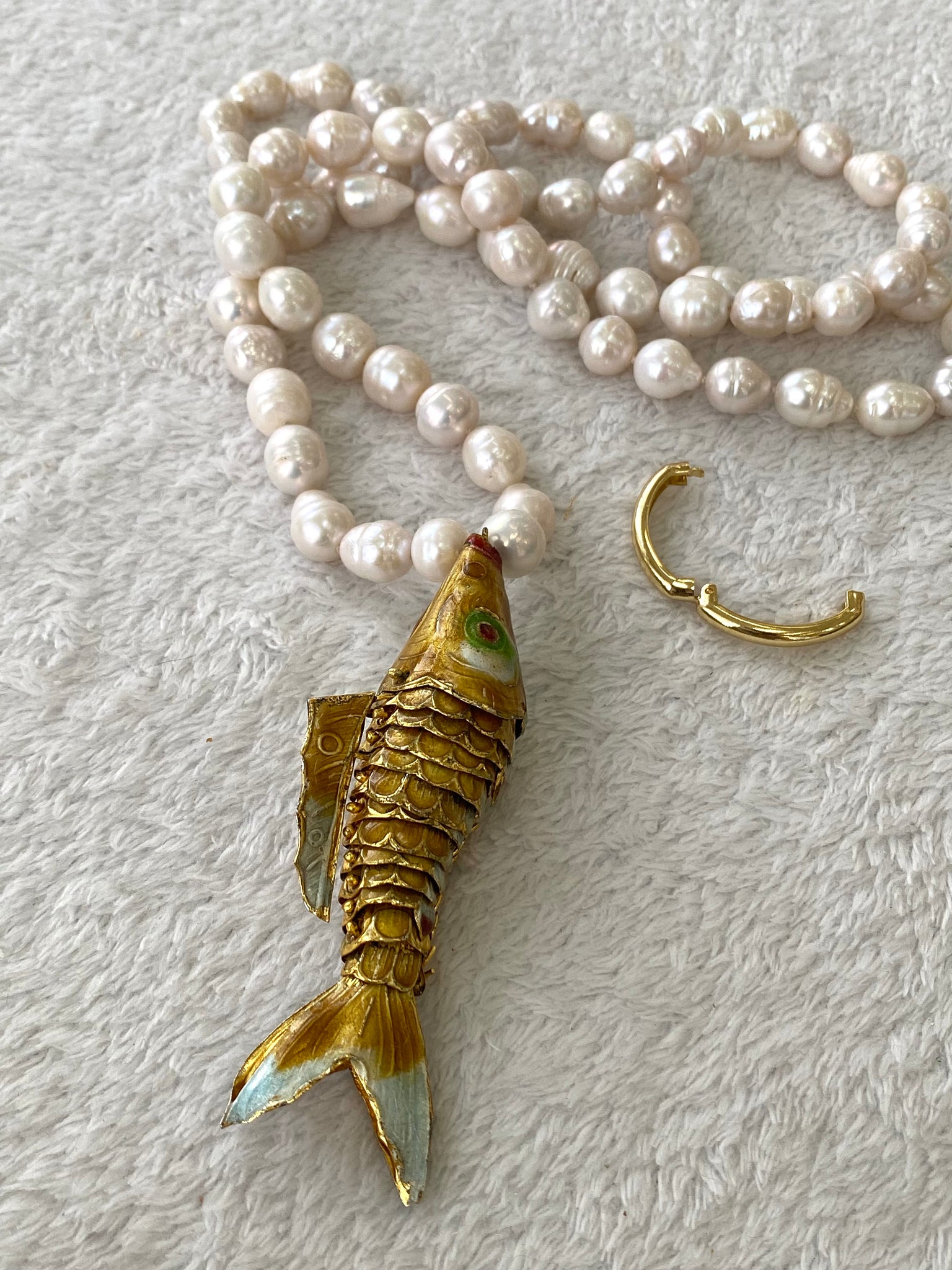 gold tone cloisonne fish pendant on long freshwater baroque pearl necklace. on this picture it is worn double short and attached with a back clasp we provide