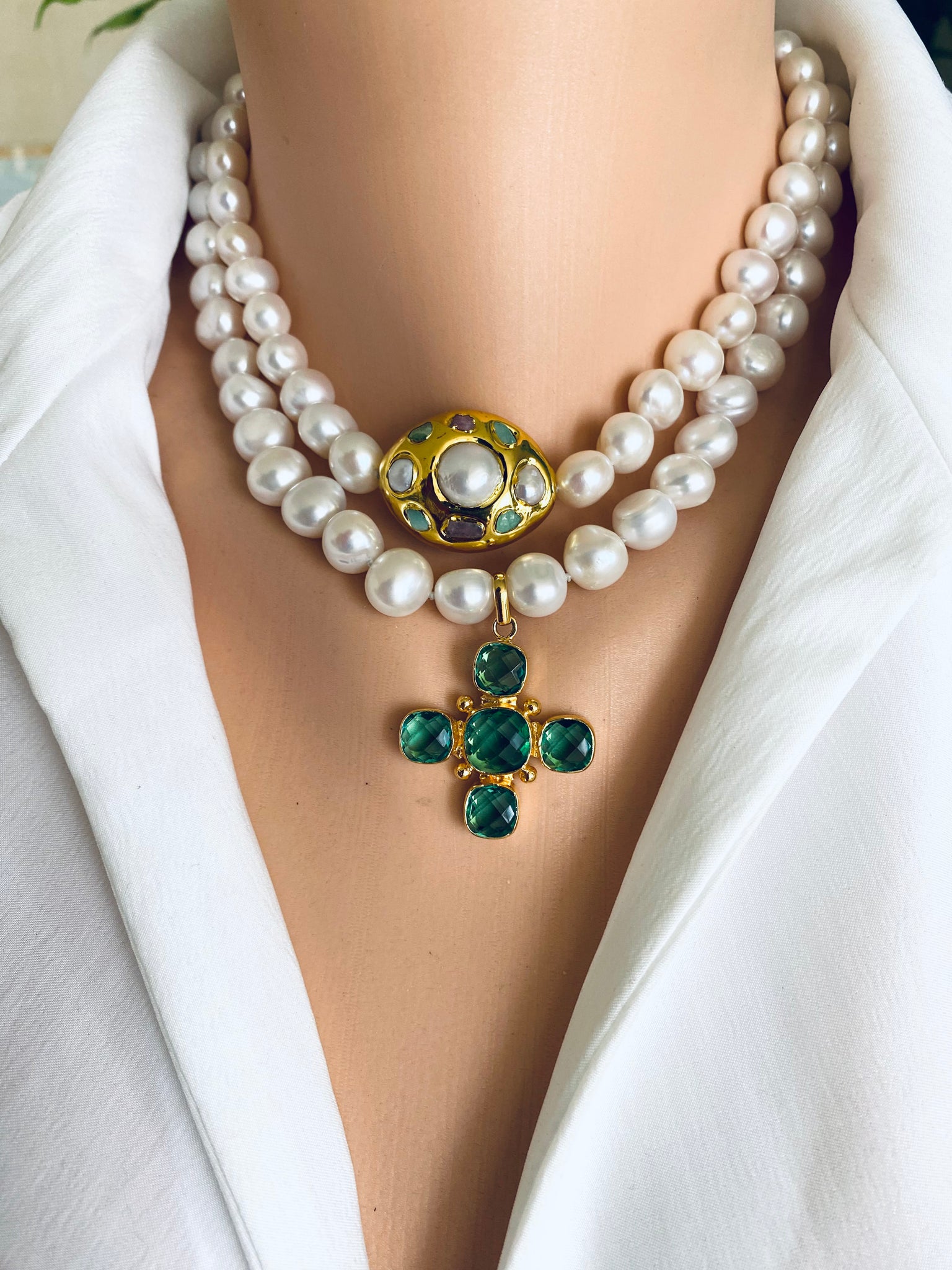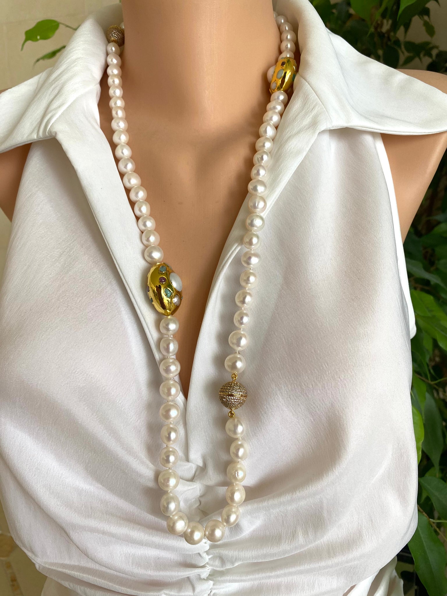 A refined short pearl necklace crafted with hand knotted 9–11mm white potato pearls, accented with 18kt gold-plated accents adorned with gemstones and pearls and finished with a sparkling CZ pavé magnetic clasp.