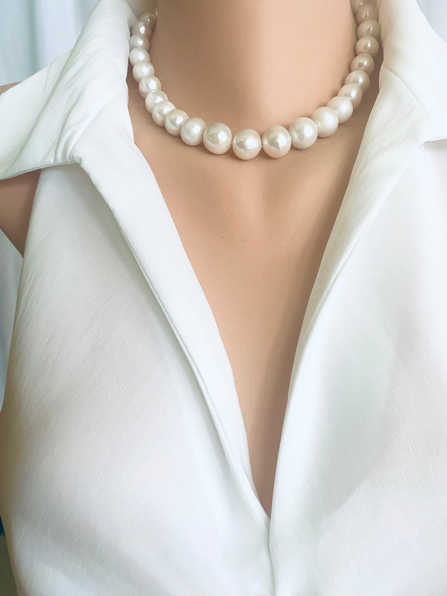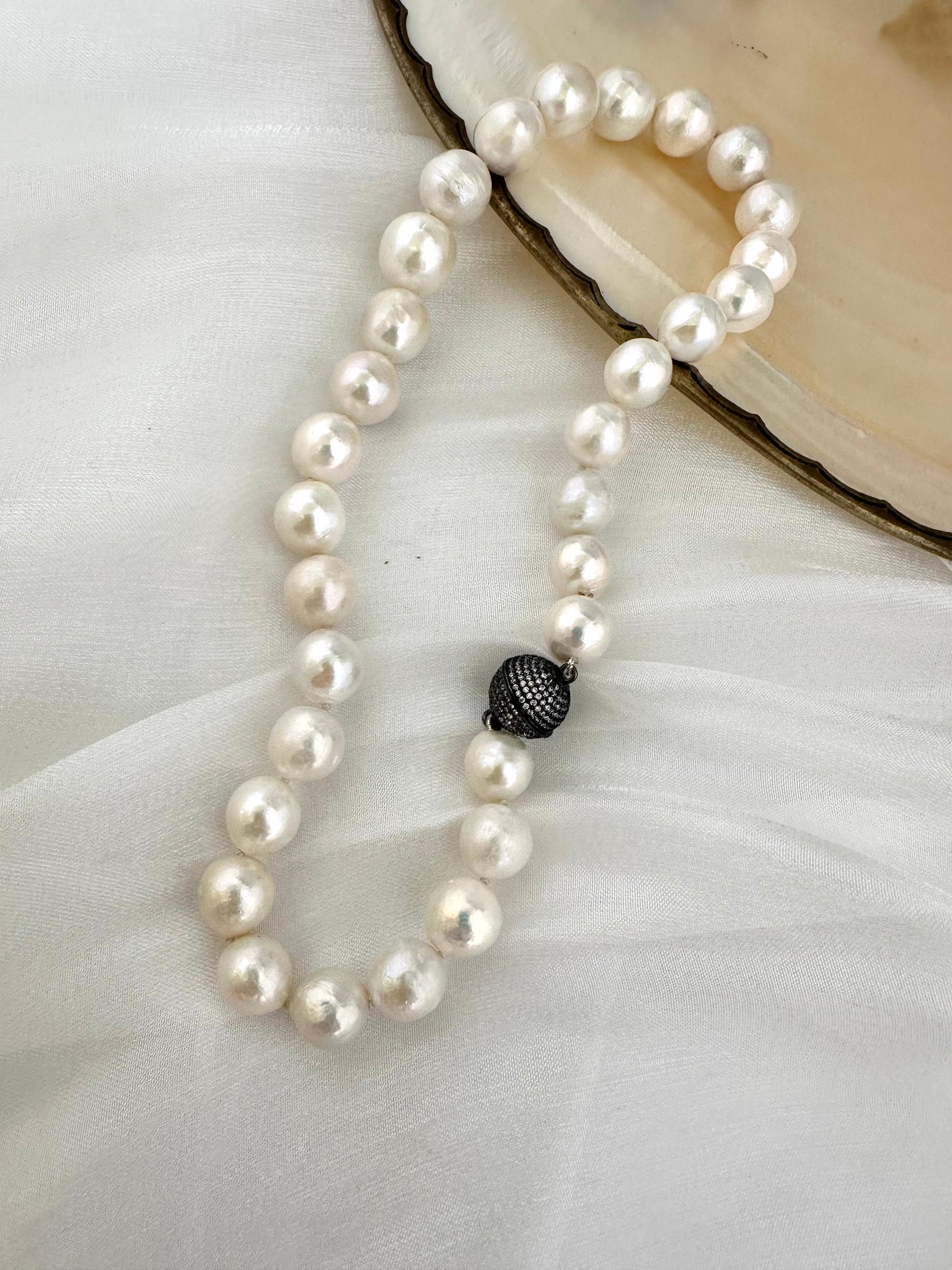 This elegant round white Edison pearl necklace is crafted with large, luminous pearls ranging from 11mm to 14–15mm, each one hand knotted for beauty and durability. Finished with a modern CZ pavé gunmetal magnetic ball clasp, this 16-inch necklace blends timeless luxury with a contemporary edge.