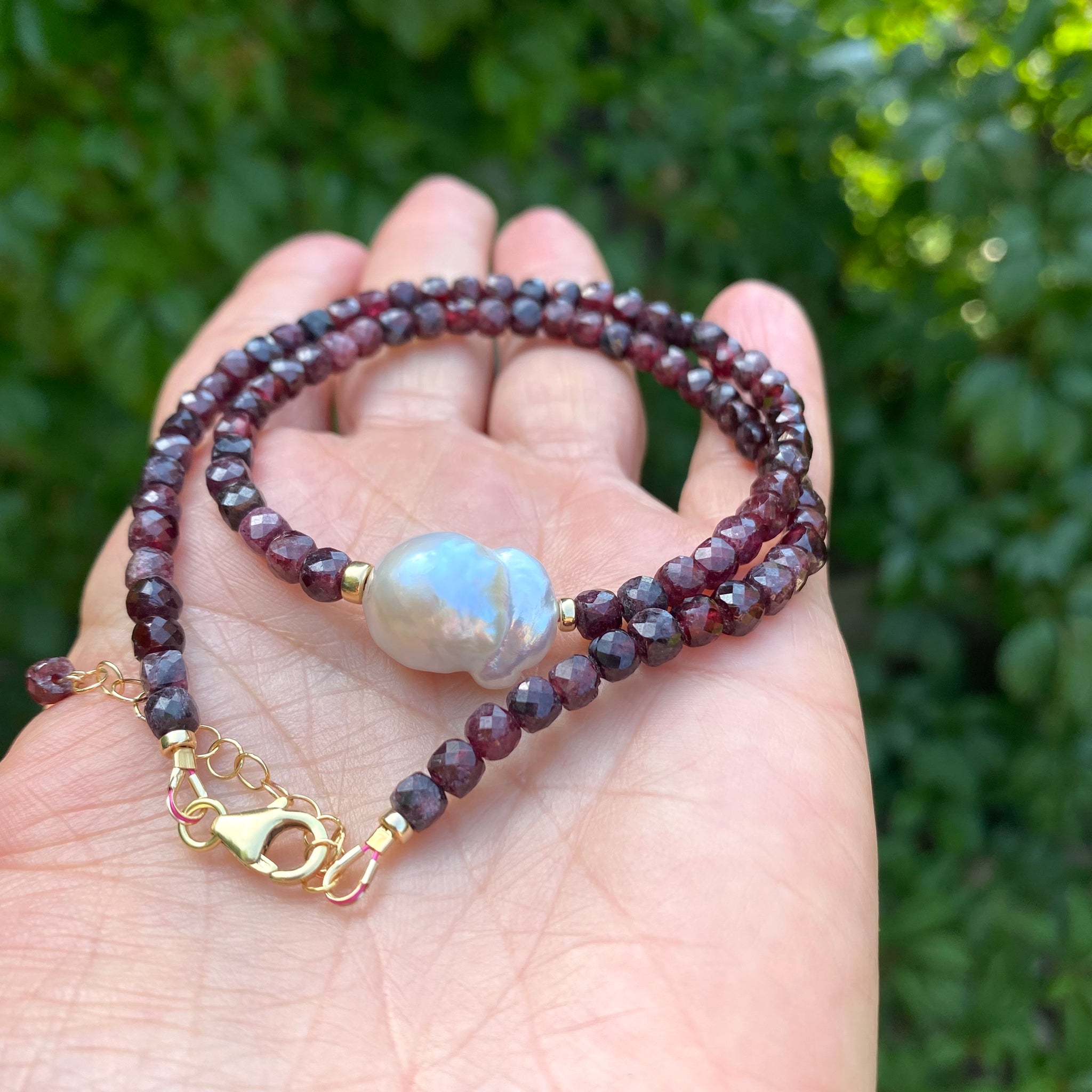 This garnet pearl necklace is finished with gold-filled details and a secure lobster claw closure, along with an adjustable extender for a comfortable, customizable fit. Its delicate scale makes it ideal for everyday wear, layering with other necklaces, or adding a subtle pop of color to special occasions.