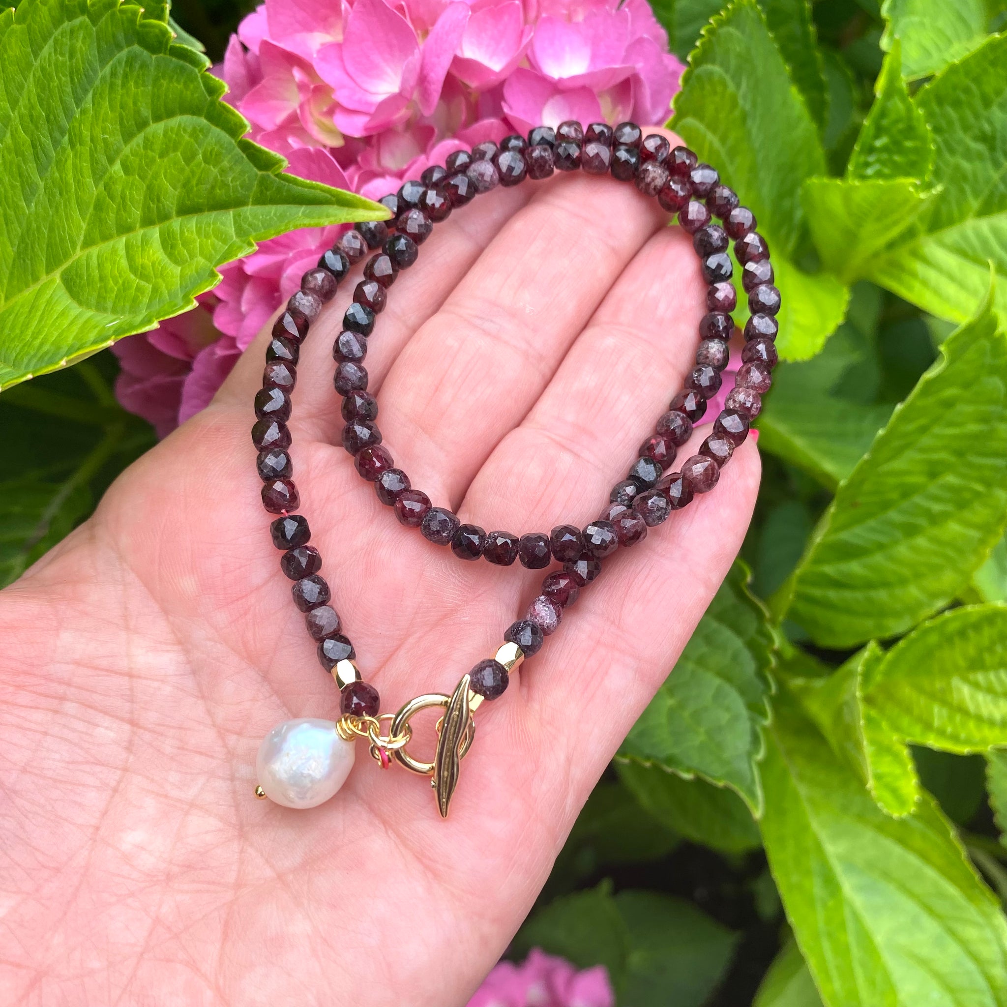 Suspended from the clasp is a tiny freshwater baroque pearl charm. Baroque pearls are cherished for their organic, irregular shapes and soft luster, each one unique. The gentle glow of the pearl creates a beautiful contrast against the bold garnet gemstones, adding balance and subtle elegance to the design.