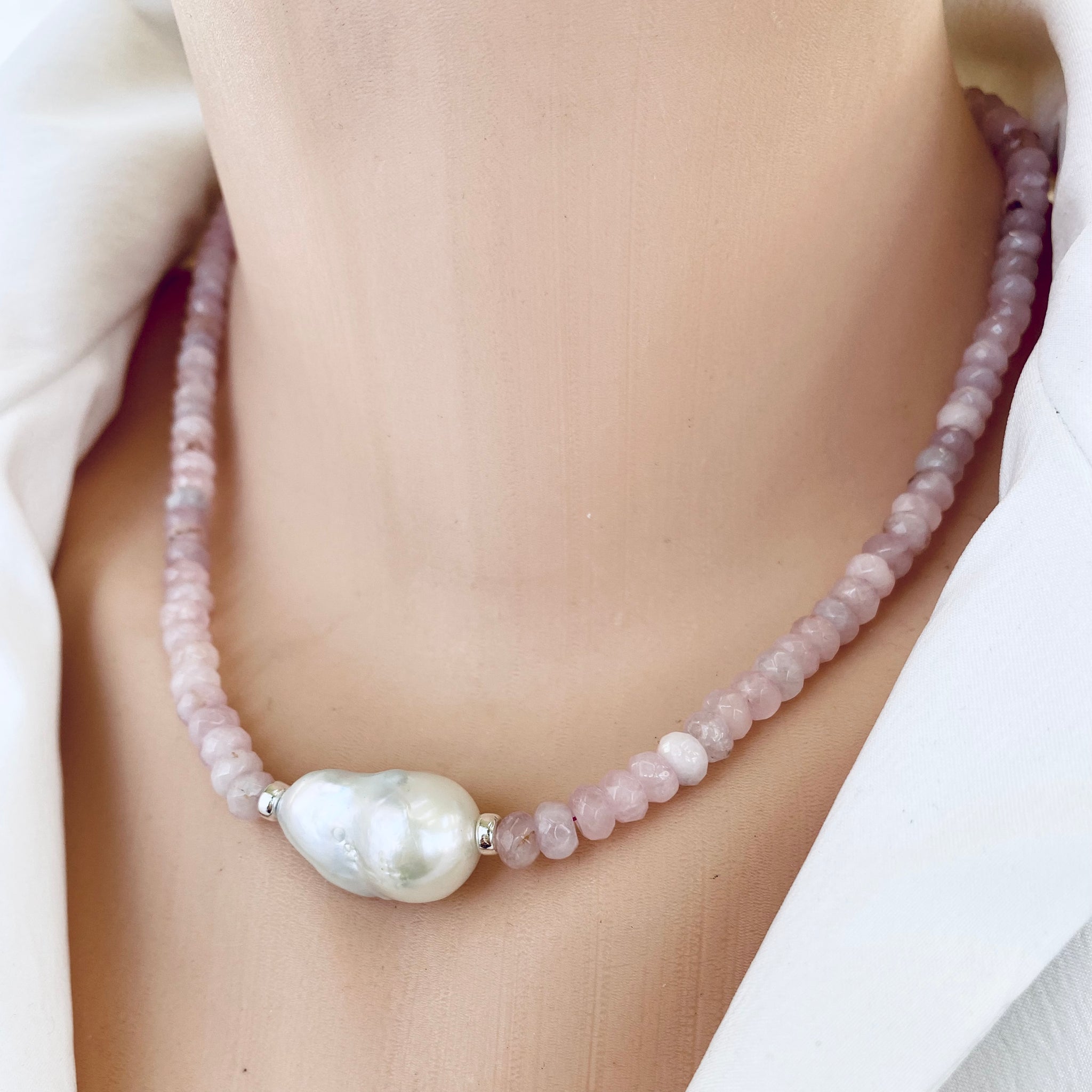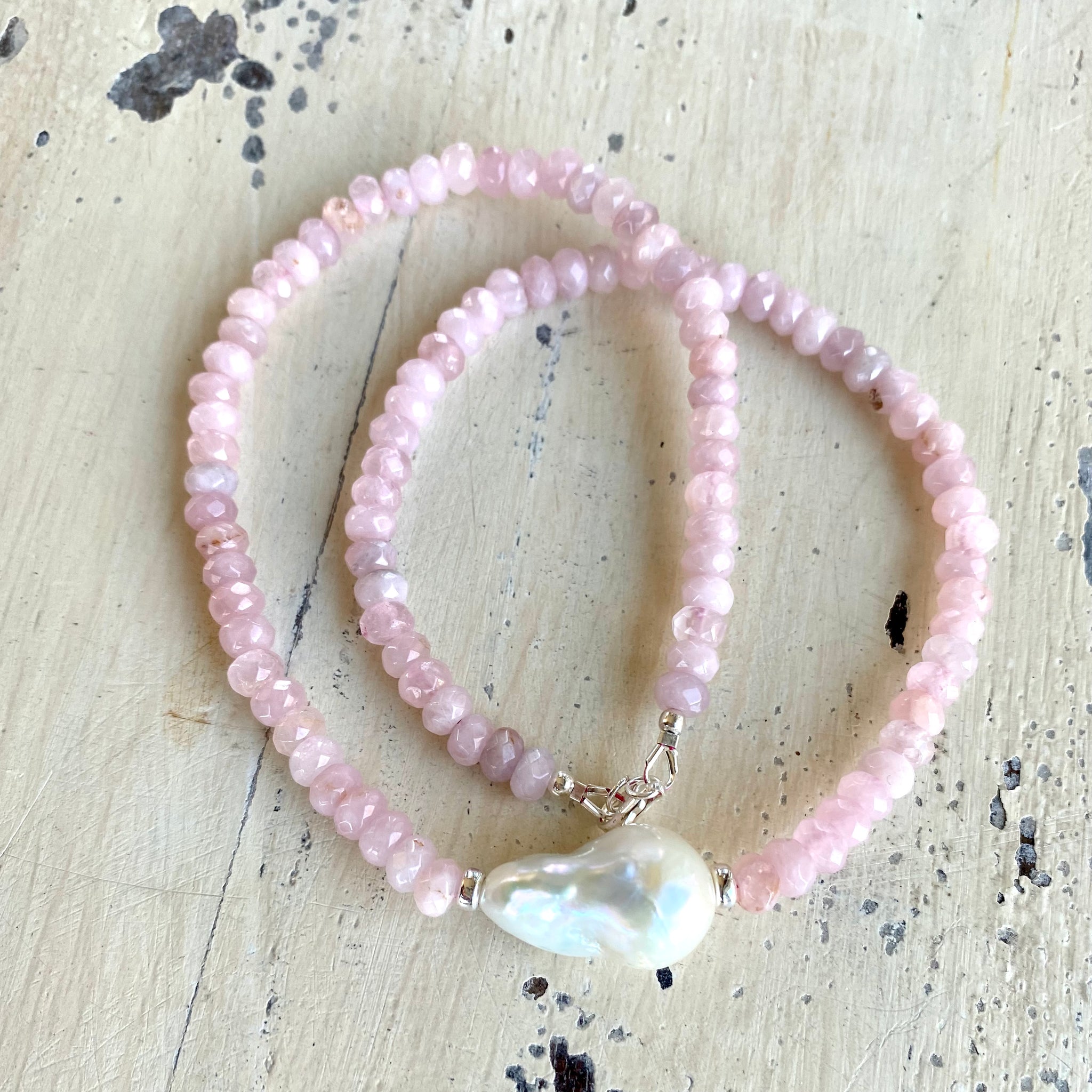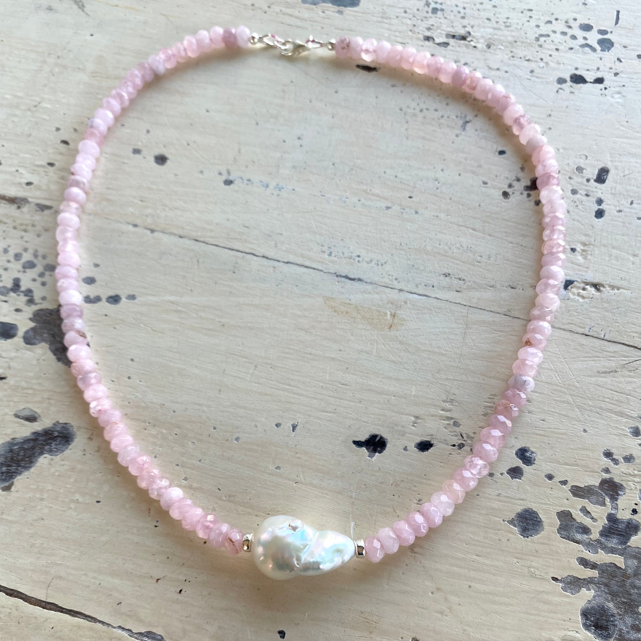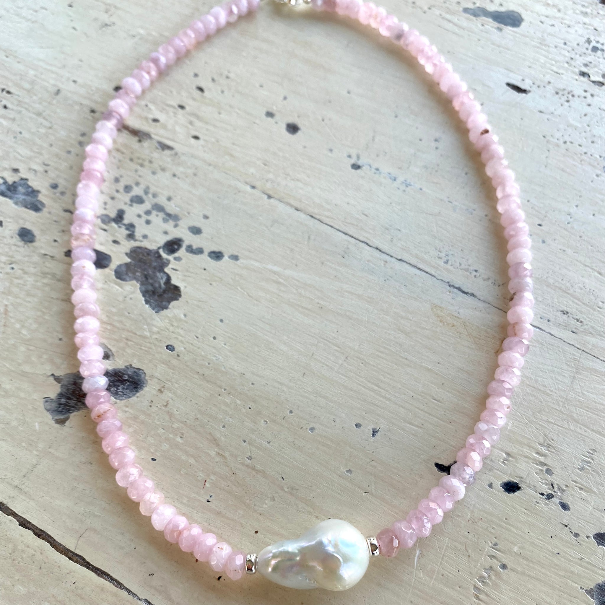The design is crafted with Madagascar rose quartz faceted rondelle beads, chosen for their gentle blush color and subtle sparkle. These beads create a soft, romantic foundation that feels light and flattering against the skin. At the center, a striking large freshwater baroque pearl serves as the focal point, adding organic texture and one-of-a-kind character. Each baroque pearl is naturally unique, making every necklace slightly different and truly special.