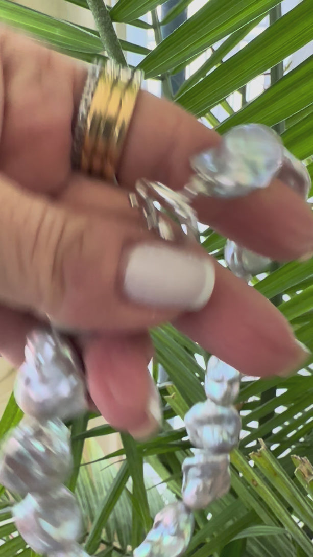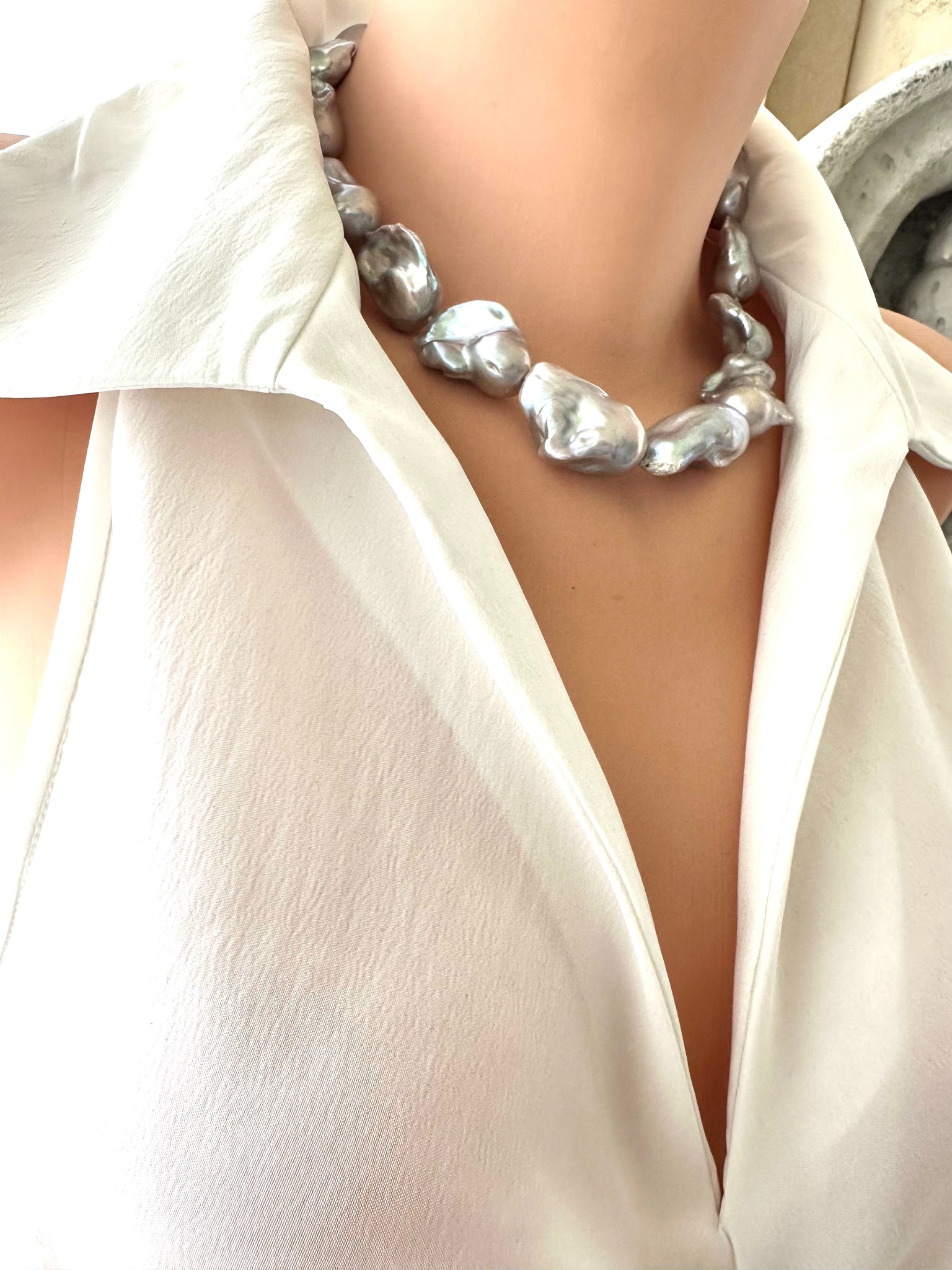 Make a bold and elegant statement with this handcrafted baroque pearl necklace, designed with large silver-grey pearls that glow with natural iridescence. Each baroque pearl features striking undertones of pink, green, and metallic sheen, creating a sophisticated palette that catches the light beautifully. Their organic, sculptural shapes make this piece a true one-of-a-kind treasure.