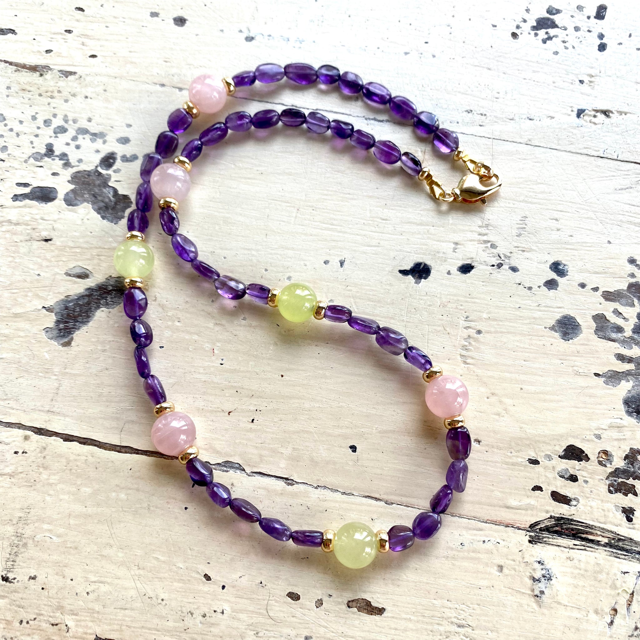 Collier composé de perles d'améthyste pépites, ornées de perles rondes lisses en quartz rose et en jade vert citron. Composants plaqués or.