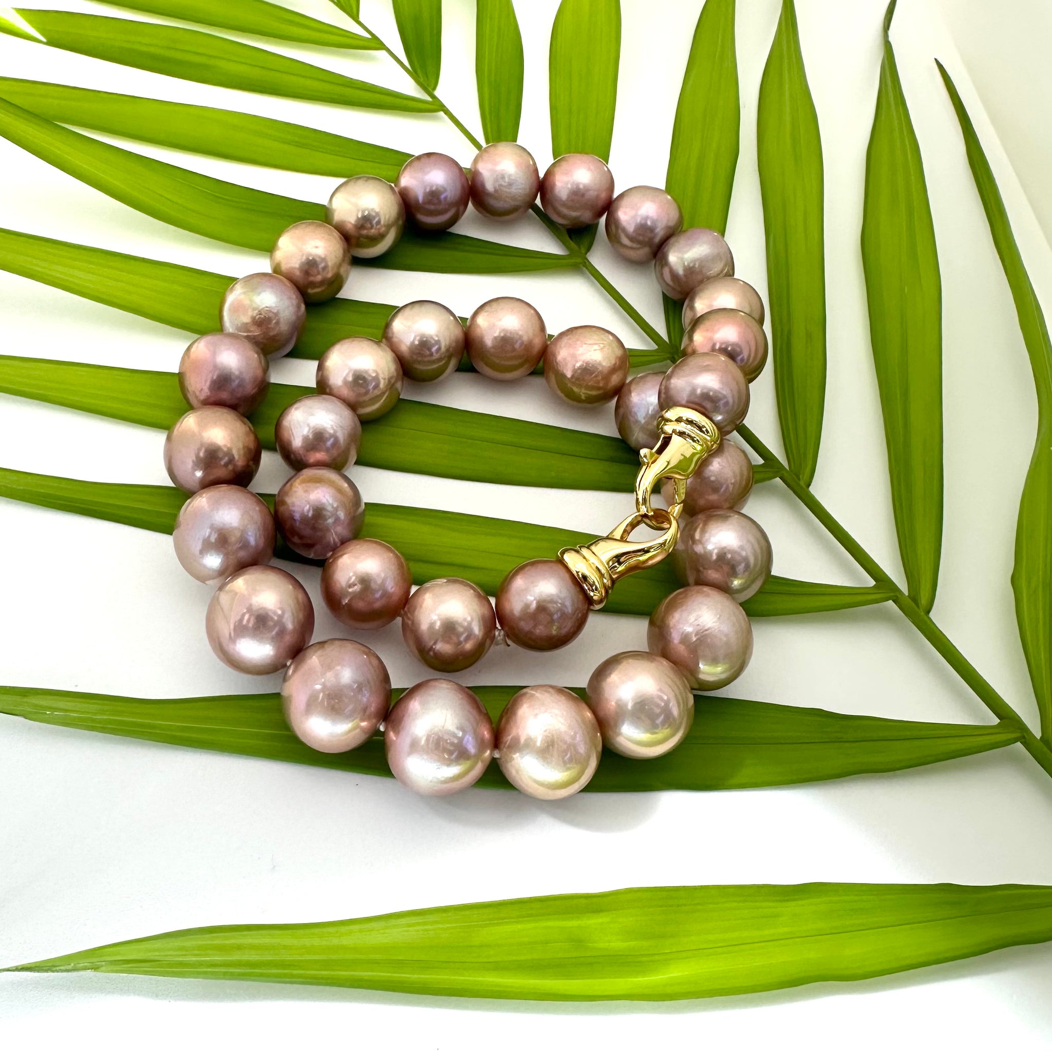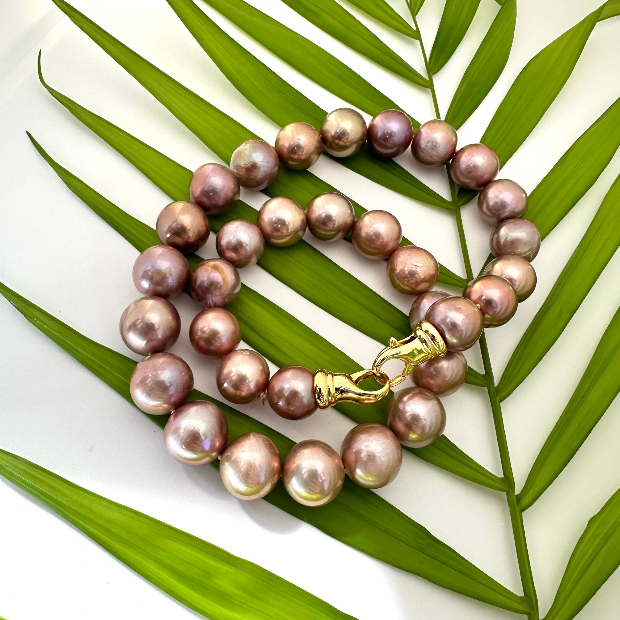 This Metallic Edison Pearl Necklace is a bold and timeless statement of natural elegance. Handcrafted in Canada by a licensed gemologist, this metallic edison pearl necklace features large, near-round Edison freshwater pearls measuring 12–14 mm. Each pearl is unique, displaying subtle variations, soft metallic lustre, and gentle imperfections that celebrate authentic, organic beauty.